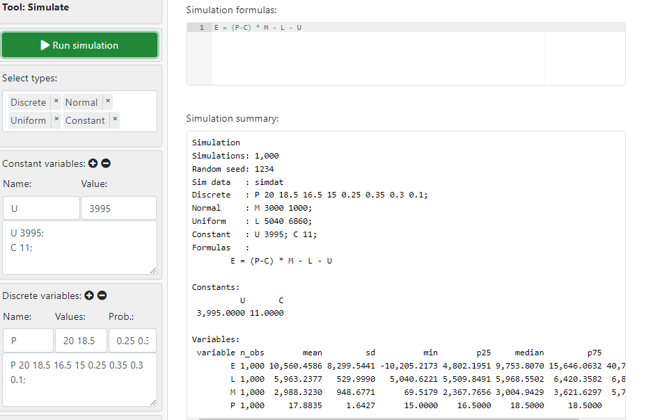 - Variables to re-simulate: 시뮬레이션을 돌리면서 바뀌는 변수, 즉 매번 값이 변하는 변수이다. 예를 들어, '월별' 수익을 계산할 때 달라지는 변수를 여기에 넣어주면 된다. ex. 고객 수. cf. 직원 월급이나 메뉴 가격은 매달 바뀌지 않을 것이므로 포함하면 안 된다.