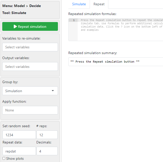 - Group by: 시뮬레이션을 여러 번 돌릴 때 관측값을 어떻게 묶을 지 선택해야 한다.