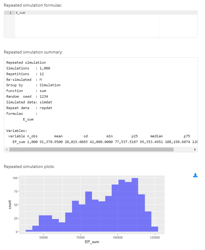 그 다음 Apply function 은 내가 시뮬레이션 데이터를 어떻게 처리할 지 골라주면 되는데, 월별 수익을 합한 일년 총 수익이 궁금하다면 'sum'을 선택하면 된다.